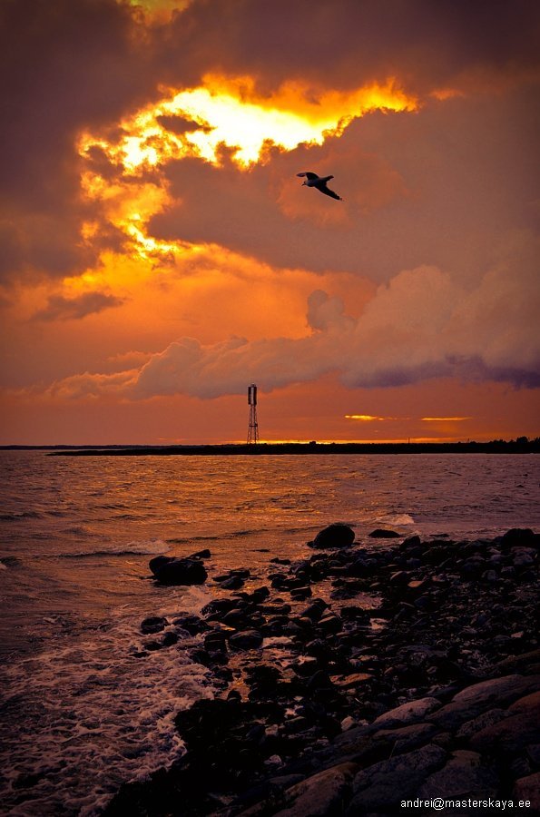 Вообще-то чайки только в баснях прекрасны, когда мечутся между тучами и морем, предрекая бурю и прочие неприятности. На самом же деле они парят над твоей головой, ищут чего бы стырить и по ходу метко гадят в темечко. Эта птЫця как раз умудрилась «отстреляться» и взяла курс на небо. Предрекать революцию на ночь глядя.
